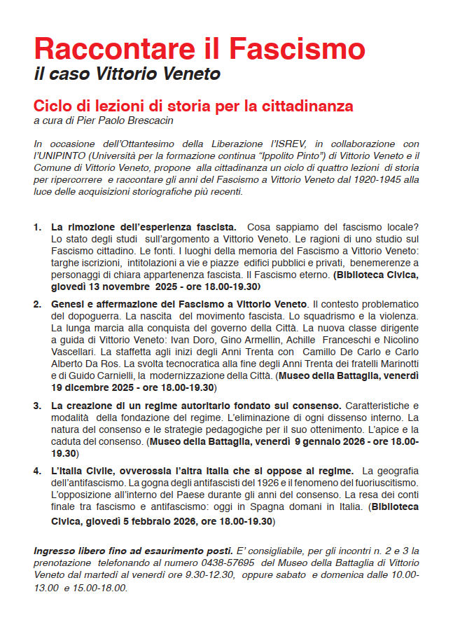 Destinatari la classe 4^ A del Liceo scientifico 'M. Flaminio'. Organizza l'ISREV in collaborazione con il Liceo scientifico 'M. Flaminio' di Vittorio Veneto.